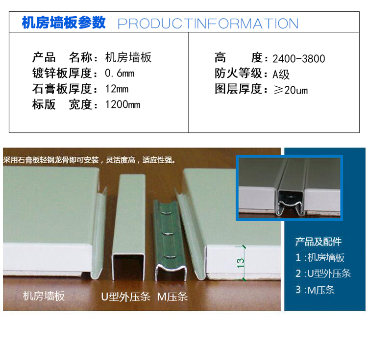 表面材料:鍍鋁鋅鋼板SGCC T=0.5/0.6/0.8MM,表面白色烤漆:環(huán)保聚氨酯涂層厚度≥25UM;鋼板背襯復(fù)合12MM優(yōu)質(zhì)石膏板。